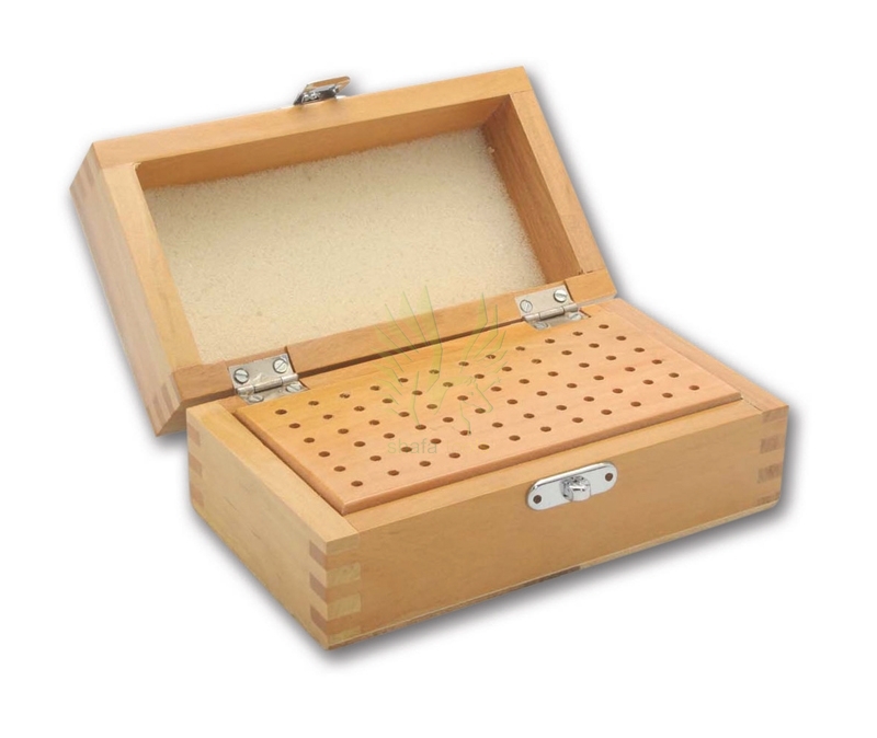 Nicely varnished wood boxes to store burs. Have a hinged lid and clasped closure. Will hold burs, brushes, drills, miniature buffs 3/32 inch & 1/8 inch shank
