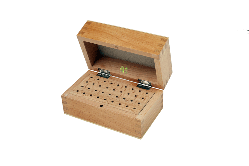 Nicely varnished empty wood box to store burs. Will hold brushes, drills, miniature buffs. With a hinged lid.