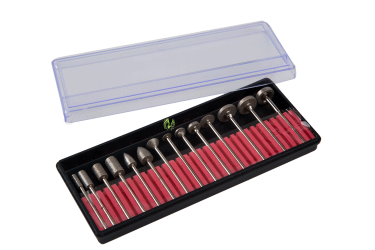 A set of 14 assorted diamond-coated burs, neatly packed in hard plastic case with transparent cover.