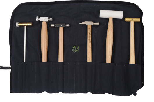 Durable canvas pouch holds a set of 6 hammers, specially keeping in mind the needs of jewelry craftsman. contains a swiss-style riveting hammer, a nylon mallet, a nylon & brass head hammer, a chasing hammer and a ball-pein hammer.