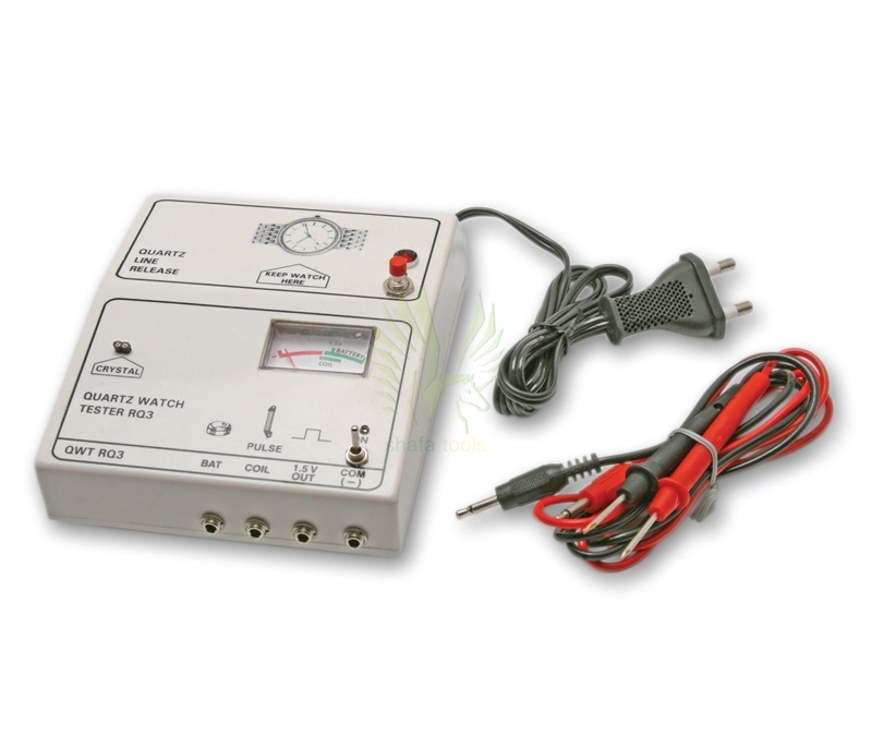 Especially designed for testing analog quartz watches. The precision analogue meter tests the watch cell, measures resistance of the coil, and checks electronic circuit board for pulses. Use this tester to check motion works for freedom in the gear train, without taking the watch back off. Powered by two ‘AA’ batteries or can be operated on AC. Measures 5†x 5 ¾â€, supplied complete with test probes