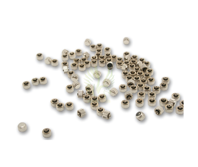 Waterproof chromed/golden-colored buttons for wrist watches. Priced per 100; sold in an assortment of short, medium & long pipes
