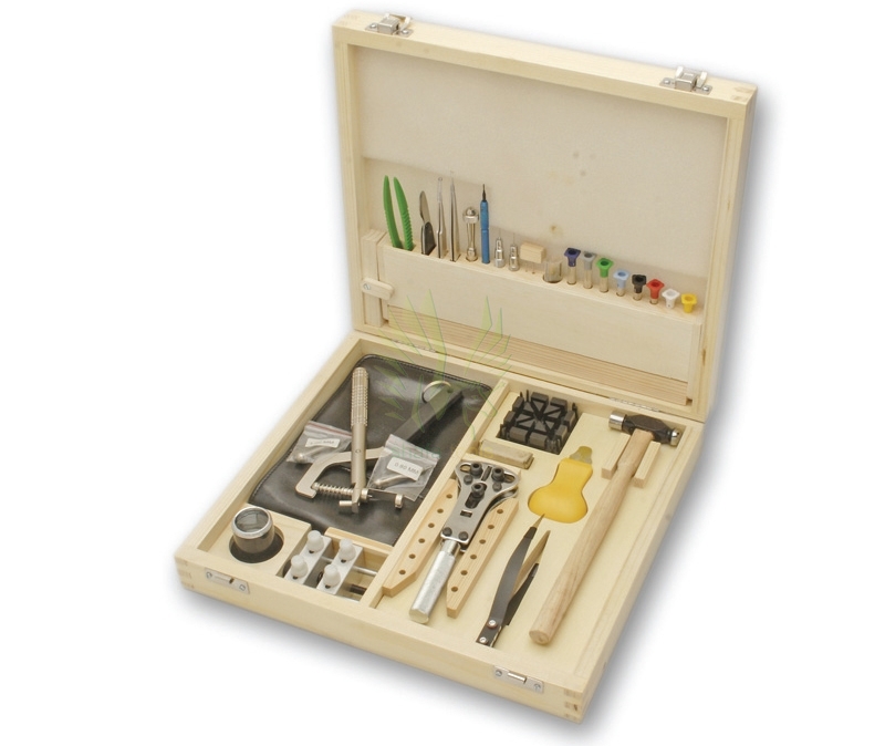 Deluxe wooden box with all the essential tools that a watchmaker needs: • Chain Link Removing Pliers • Jaxa Case Opener • Battery Testing tweezers • Plastic tweezers • Push type Back Opener • Plastic Bracelet Holder • Ball Pein Hammer 2 oz • Aluminum Case Holder • Eyeglass with Silver Ring • Knife Case Opener • Tweezers SA quality 2 pcs • Pin Tong • Link Removing Pins • Set of 8 screw drivers only (with extra blades) • Blue side bar remover