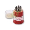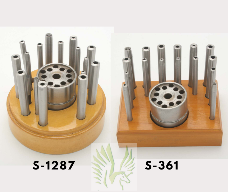 S-361 – Large steel anvil with 10 holes of graduated sizes and 16 punches – 4 flat-faced hollow, 10 round-faced hollow and 2 assorted hole closing sizes, all neatly mounted on a wooden stand. To withstand ocean travel, punches and anvil have been packaged in grease.