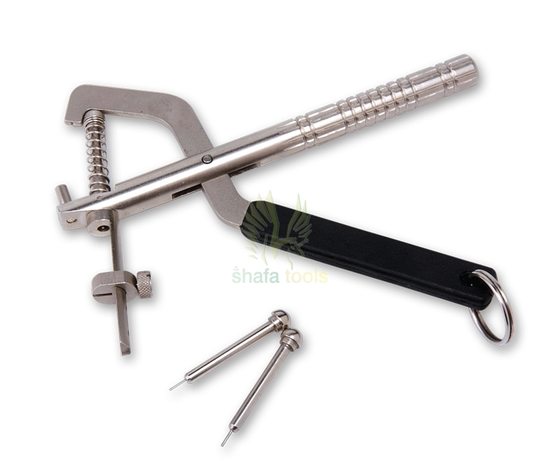Ideal for removing stubborn watch bracelet link pins easily without damaging the watch strap. Knurled jaw for pulling out pusher pins once they are exposed. All-new, non-adjustable stopper. Quality, knurled metal handle. Includes 2 extra pusher pins of 0.80mm & 1.00mm. Packaged in an attractive leather pouch