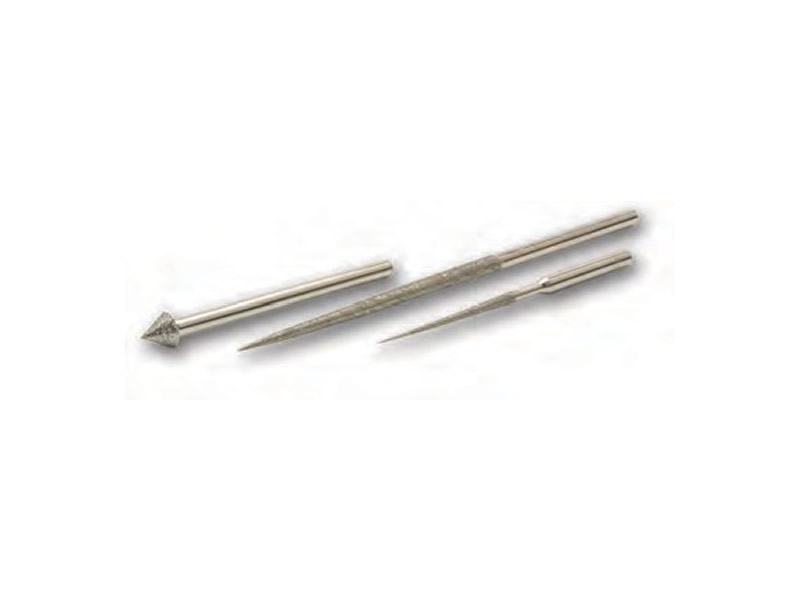 3-piece set, consisting of a three differently shaped diamond tips for smoothening or enlarging holes in pearls, glass, ceramic & metals. These diamond-coated reamers have 1/8” shanks and are supplied in the following shapes