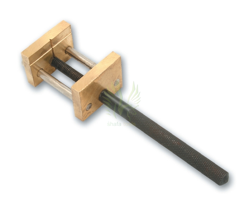 Brass & steel hand vise. Jaws measure 1†x 1 ½†with grooves on one side. Ideal for securing watch cases. Overall length is 5 ¼â€