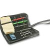 The complete watch tool kit organized in a real leather pouch. Kit is specifically designed to meet the needs of the watch repairer holding the essential tools for watch repairing, servicing, back-case opening, link removing and battery changing. Kit includes: • Zippered, real leather case with elastic bands to protect tools • Pin pusher with wooden handle • Plastic tweezers • Brass tweezers • Flat-Nose Pliers (4 ½â€) • Emery stick • Ball-pein hammer • Cleaning cloth (12†x 12â€) • Universal watch case opener (Jaxa type) • Assorted packet of 100 spring bars (steel) • 2 pcs Pin punch set (0.8mm & 1.0mm) • 2 pcs high-quality stainless steel tweezers • 3 pcs screwdrivers • Pin Tong 4-mouth • Hands presser (nylon tips) • Hands remover Presto type • Fiber glass scratch brush • Cushion pad • Spring bar removing tool (black) • Eye glass (plastic) • Bracelet holder (plastic) • Water-proofing silicon grease • Watch back opening knife with wooden handle