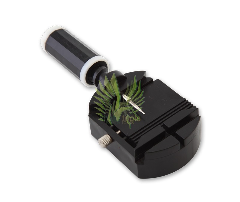 Light-weight plastic tool to safely and quickly remove link pins from watches. Side adjustment screw for watch band adjustment