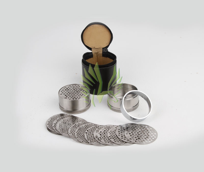Highly accurate stainless steel sieves with laser-drilled holes. Housed in a stainless steel body and packed in a leatherette zippered casing. Longlife. Smart, titanium finish on the steel sieves and the casing