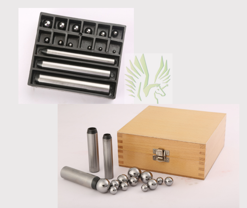 Improvised and Exclusive!! Each set of 15 consists of 3 Punches and 12 interchangeable perfect rounded, different-sized steel balls. The entire 30 pieces set consist of 24 rounded balls and 6 punches. Each 15-piece set forms a set of 12 dapping set, in small and large sizes. Punches & balls fabricated from Tempered, hardened steel. Unlike the regular doming punches, each ball is perfectly rounded to provide the craftsman with a good, even finish during doming applications