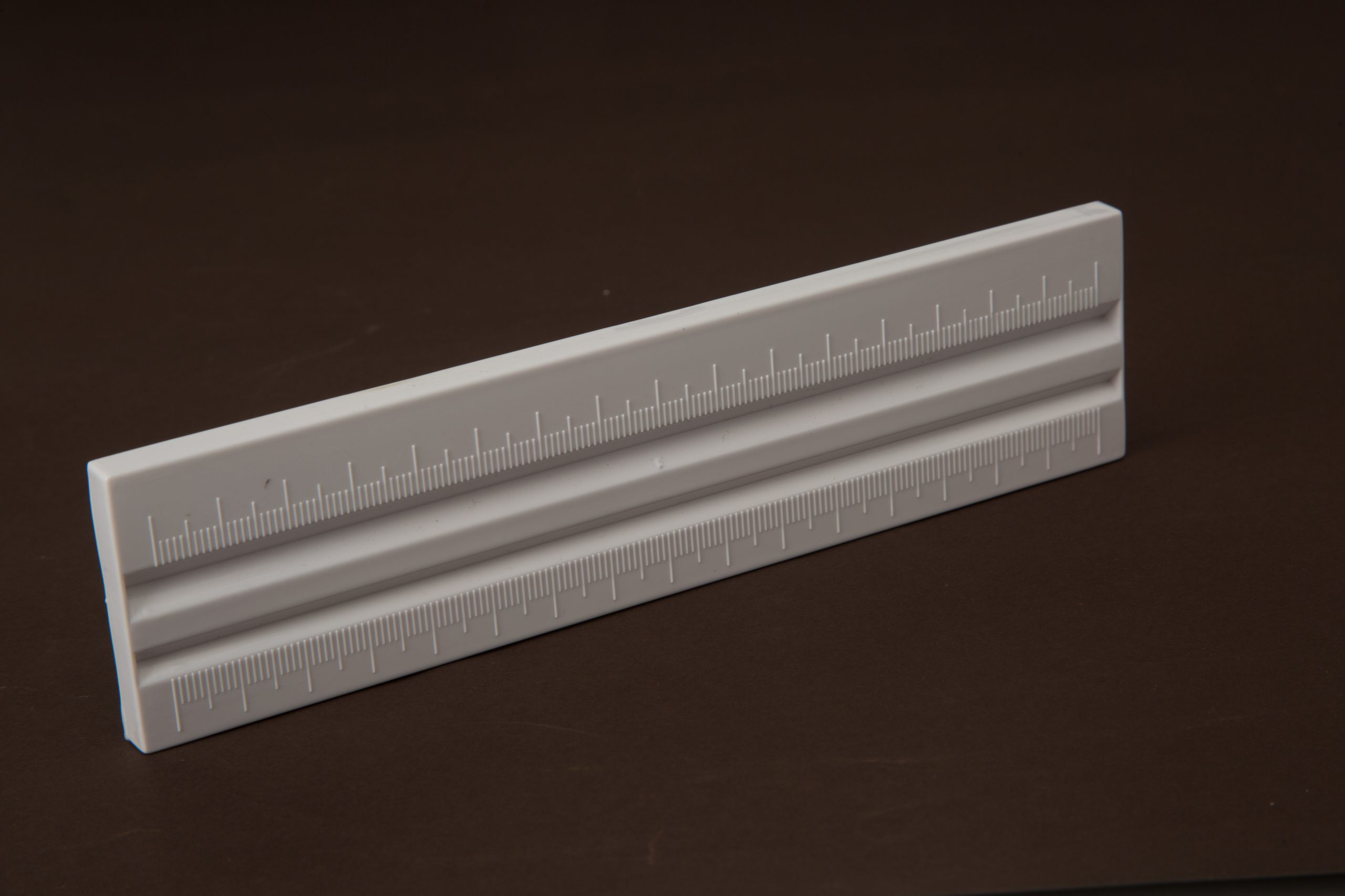 [Long white plastic stringing tray with a 16cm long double metric scale and 2 grooves – one shallow and one deep.]