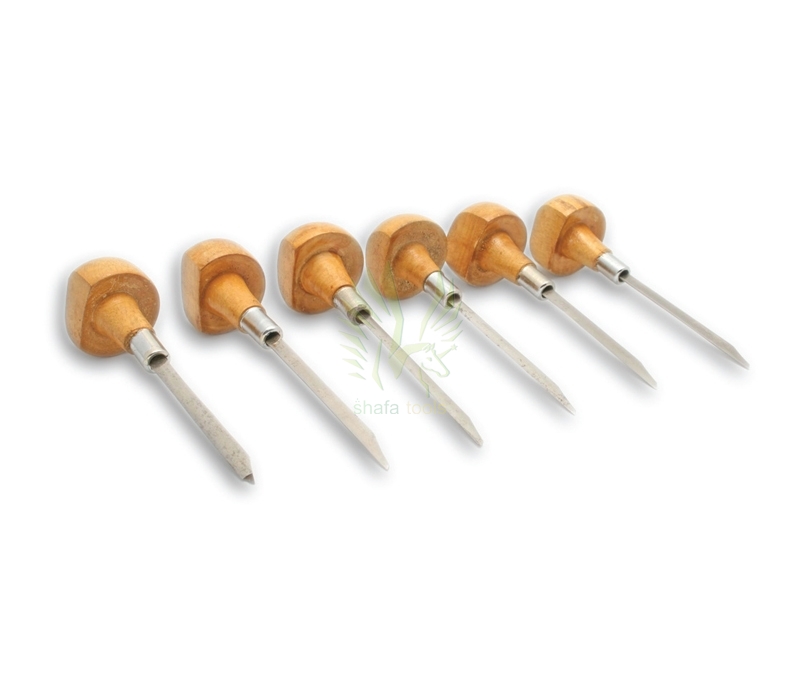 Assorted six-piece set, 4 flat and 2 tapered. Sharpened, hardened & tempered steel gravers mounted in hardwood handles. Graver handles are reinforced with a metal ferrule.