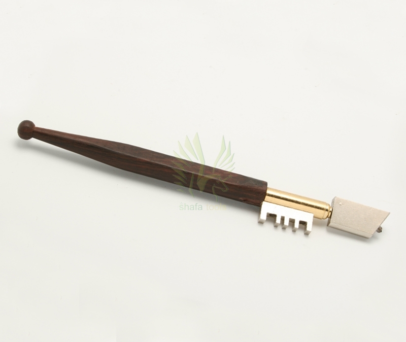 Industrial diamond chip mounted in a slotted steel holder, with a plastic handle. Tapping ball at the end of the plastic handle. Used to score a line on the glass; bending/shocking the glass on this line encourages it to split along it. Cuts will be smoother when used with a lubricant, like kerosene
