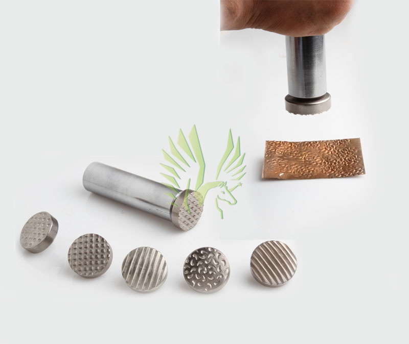 Chrome-plated, knurled steel handle with threading to easily screw on/off the six interchangeable, hardened heads with rust-free plating. 6 patterns: checkered, wide-stripes, sharp-stripes, mango, dimples & cross-hatch. Can be used for hand stamping for light impressions, or in conjunction with a hammer for deeper designs or when working on thicker metals.