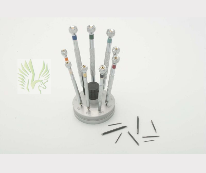 A set of 9 color-coded screw drivers mounted on a fixed round aluminium stand, with built-in extra blade storage compartment. Replacement blades included.