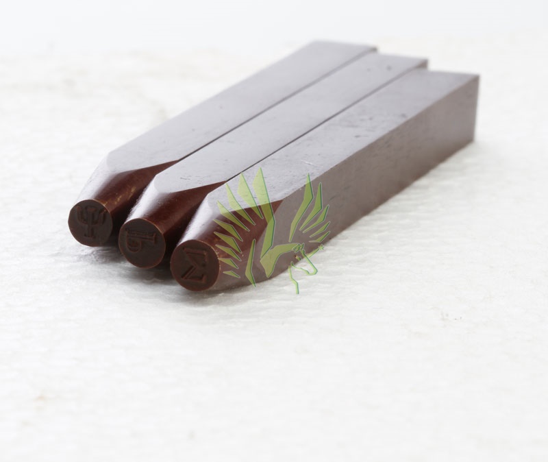 8mm square, hardened, blackened steel stamps featuring attractive block Greek letters. Set of 24 pieces. 3.25mm height of characters. Length of punch: 85mm. Can also be ordered in a wooden box with a magnetic closure, keeping the stamps upright and protected