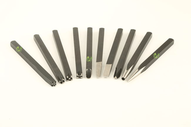 For stamping designs on soft metals like gold, silver, copper and such. Set of 10 carbon steel punches in assorted designs. 3-3/4" long.