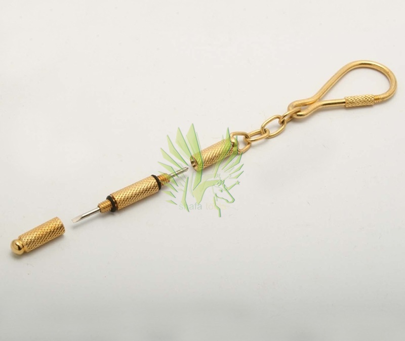 This little key chain brings more surprises. One end opens up to reveal a flat-blade screwdriver, and the other end holds a 1.6mm Philips-blade one. Sold in a pack of 24 pieces. Choice of brass or nickel